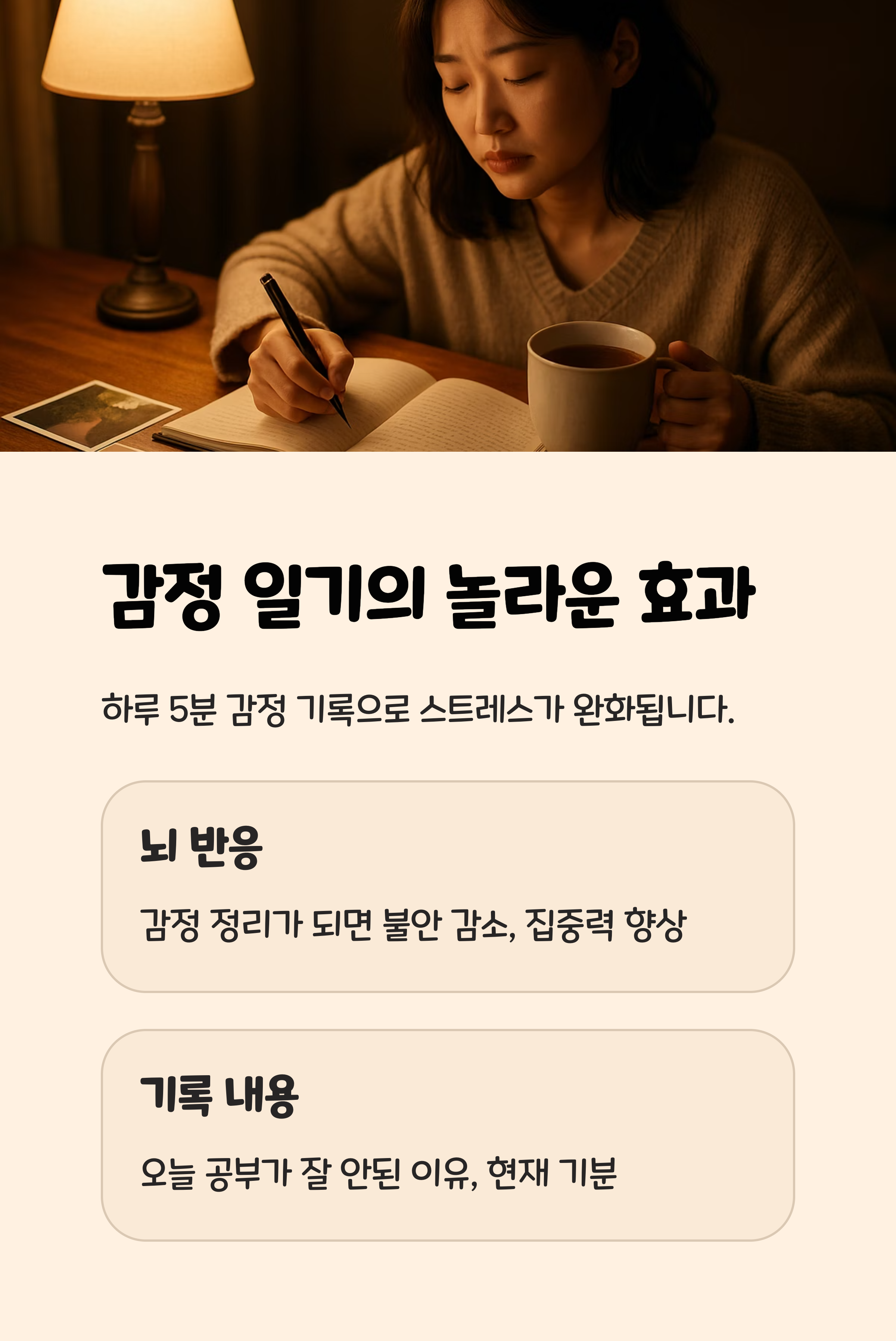 감정 정리가 되면서 뇌가 불안을 줄이고 집중력을 높이는 방향으로 반응하게 됩니다.