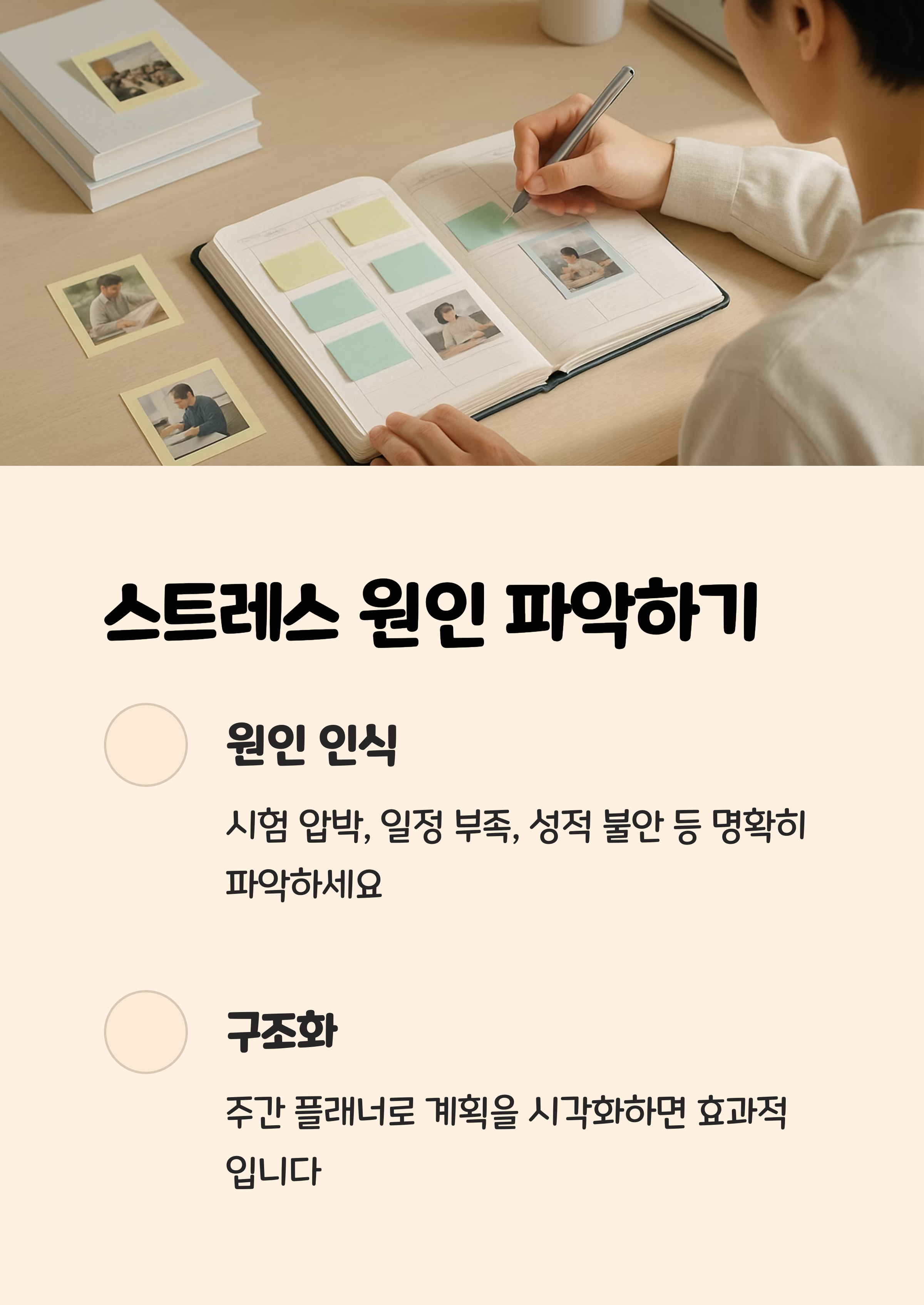 시험에 대한 압박, 일정 부족, 성적 불안 등 스트레스의 원인을 명확히 파악하는 것이 중요합니다.