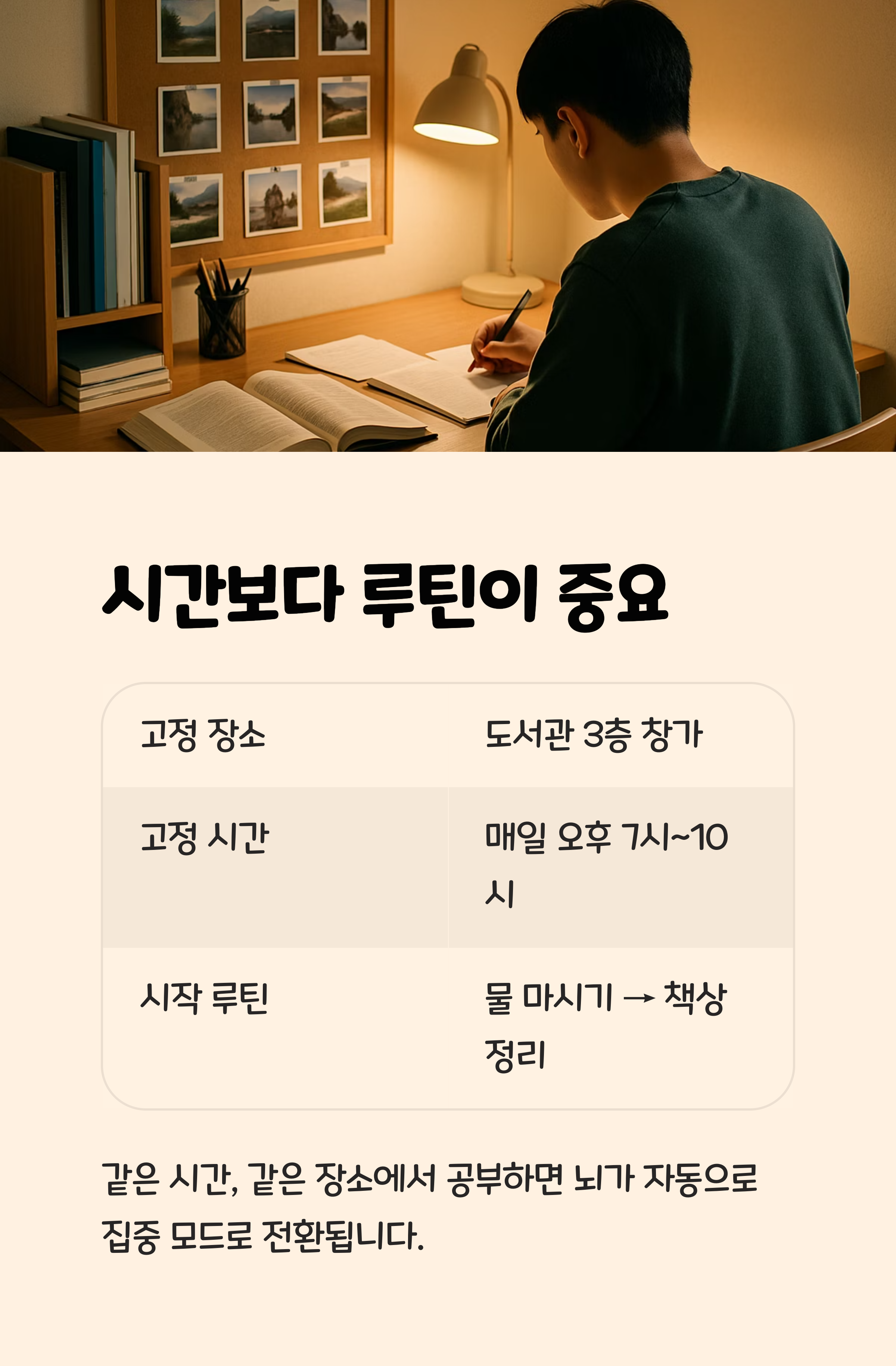 같은 시간에 같은 장소에서 공부하면, 뇌는 자동으로 집중 모드로 전환되며 스트레스는 자연히 줄어듭니다.